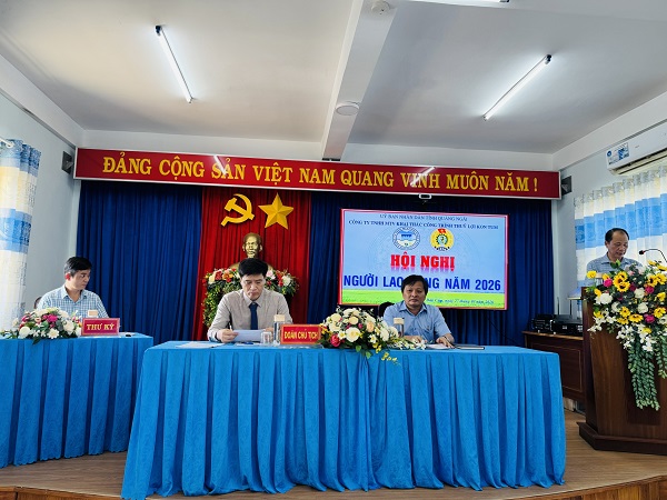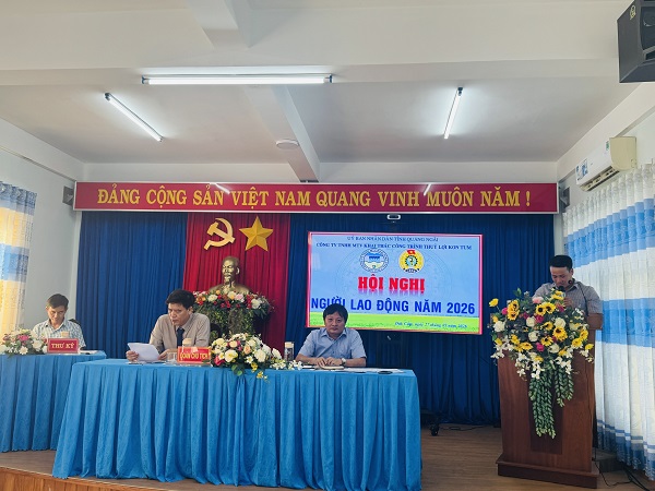 Hội nghị người lao động năm 2026 do Ban điều hành Công ty và Ban Chấp hành Công đoàn cơ sở phối hợp tổ chức vào ngày 27/3/2026, nhằm đánh giá kết quả triển khai thực hiện các chỉ tiêu, nhiệm vụ sản xuất kinh doanh của năm 2025 và đề ra phương hướng, nhiệm vụ cho năm 2026. Hội nghị, có 85/88 cán bộ, người lao động về tham dự, với tinh thần cởi mỡ, dân chủ, Hội nghị đã có nhiều ý kiến đóng góp mang tính xây dựng, tâm huyết về công tác quản lý, khai thác công trình thủy lợi. Tại Hội nghị, đồng chí Giám đốc đã tổ chức phát động Phong trào thi đua năm 2026, 100% đại biểu tham dự hưởng ứng, tạo ra không khí thi đua sôi nổi, đoàn kết, phấn đấu thực hiện hoàn thành đạt và vượt mức các chỉ tiêu, nhiệm vụ theo Kế hoạch sản xuất kinh doanh năm 2026 và các chỉ tiêu, nhiệm vụ được Uỷ ban nhân dân tỉnh Quảng Ngãi giao.
